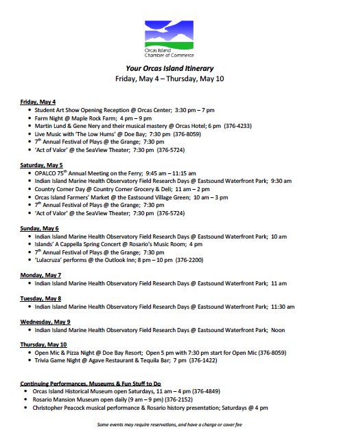 Every Thursday evening the Orcas Island Chamber of Commerce issues an Email Blast, detailing everything you need to know about this magnificent island. When you subscribe, you also have access to a complete restaurant and dining list, as well as a “What’s Happening on Orcas Island” itinerary.